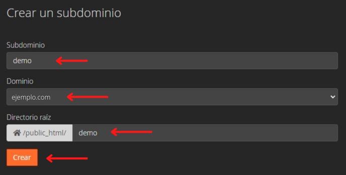 - Debajo de Crear un Subdominio en el campo Subdominio debe ingresar el nombre de su subdominio como por ejemplo demo. Si tiene varios dominios, seleccione el dominio apropiado de la lista desplegable.