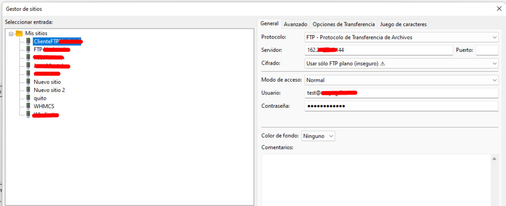 - Ingrese al Gestor de sitios y agregue una nueva conexión con los detalles como se muestran en la imagen a continuación.