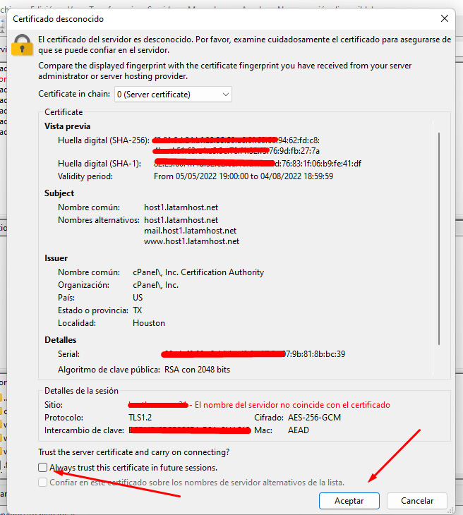 Marcamos la opción Always trust this certificate in future sessions y le damos en Aceptar.