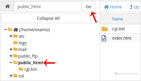 - Navegue hasta el directorio donde desea cargar sus archivos. Por ejemplo, si desea cargar su archivo en la carpeta HTML pública, primero debe ir a /public_html. En el lado izquierdo, puede ver una lista de directorios. Haga doble clic en la carpeta public_html.