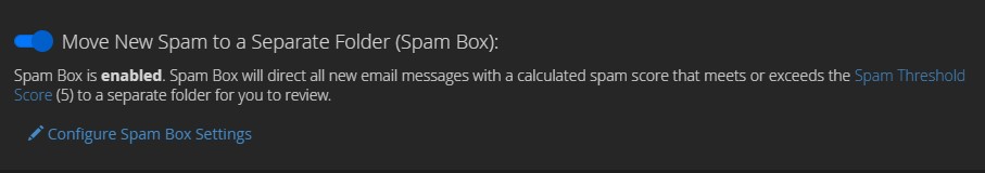 - Haga clic en Process New Emails and Mark them as Spam para habilitarlo. Si el ícono de palanca se muestra en color gris, significa que Apache SpamAssassin está deshabilitado y debe habilitarlo.